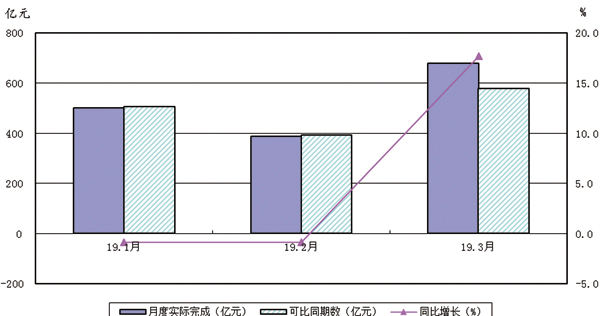 2019年1-3月規(guī)上企業(yè)營業(yè)收入月度完成及同比變動(dòng)情況見圖1。
