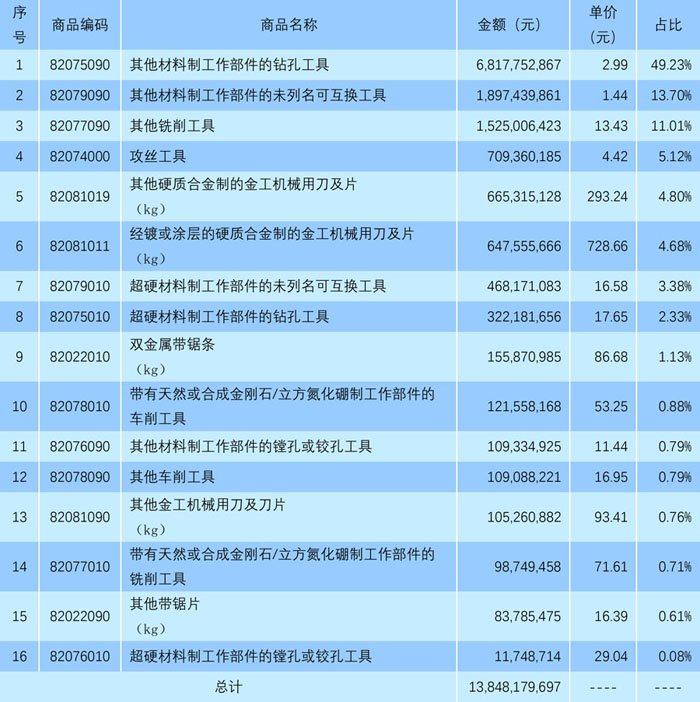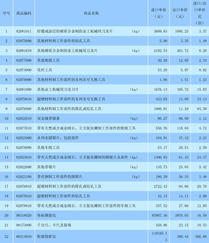 (3)附表中,在計(jì)算產(chǎn)品單價(jià)時(shí),圓鋸片、刀片、帶鋸條的單位采用公斤(kg),其他類(lèi)產(chǎn)品以件為單位。