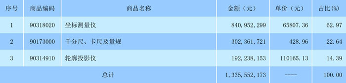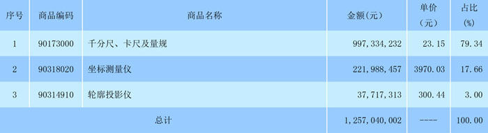 量具出口額(10億元人民幣)遠(yuǎn)遠(yuǎn)大于進(jìn)口額(3億元人民幣),量?jī)x出口額(2.6億元人民幣)遠(yuǎn)遠(yuǎn)小于進(jìn)口額(10.4億元人民幣)。