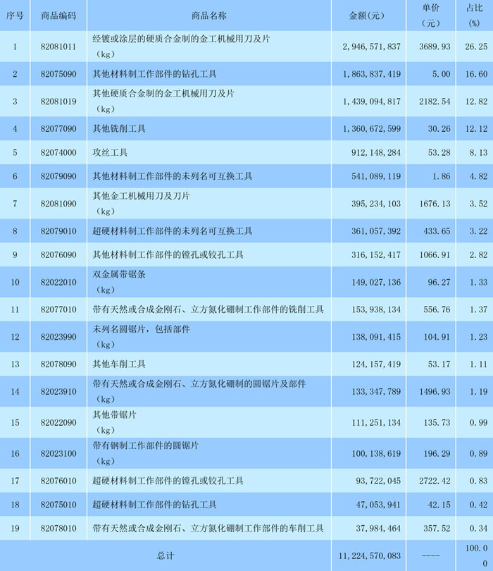 中國(guó)機(jī)床工具工業(yè)協(xié)會(huì)工具分會(huì)秘書(shū)處收集和整理了2019年我國(guó)工具(刀具、量具、量?jī)x)進(jìn)出口海關(guān)數(shù)據(jù),并進(jìn)行了計(jì)算和分析,供業(yè)界參考。所有表格都在文末。