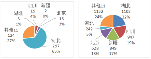 圖20是2019年金剛石鑿巖鉆探工具進口省市分布。由圖20可知,計有16個省市進口該產品。進口總量459噸,總額4919萬美元。前5名占進口量的73%,占進口額的76%;其他11個省市分別占27%、24%;河北進口量最大,占總量的65%;湖北進口額最大,占總額的22%。平均進口單價是107.1 $/kg;最高的是新疆,4745 $/kg;最低的是河北,8.1 $/kg;最高最低價差586倍,具體產品可能根本不同。