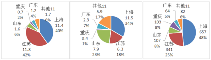 a.數量分布(單位:噸) b.數量分布(單位:萬套) c.金額分布(單位:萬美元)
