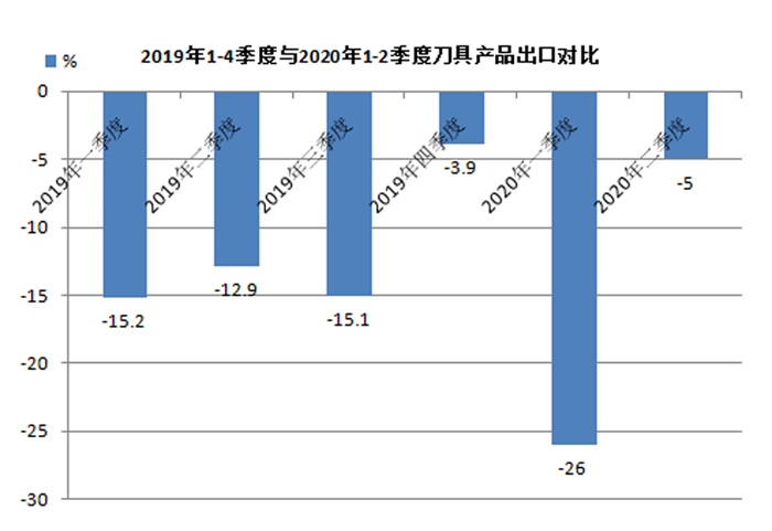 根據分會季度報表統計顯示,2019年刀具出口價值量(銷售收入)進入下行通道,一季度同比下降15.2%,二季度同比下降12.9%,三季度同比下降15.1%,四季度同比下降3.9%。2020年一季度刀具出口同比劇烈下降26%,二季度同比下降明顯收窄,為5.0 %。