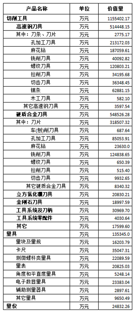 2019年,工具分會參加年度統計的會員企業共生產各類刀具110695.11(117055.63)萬件,比上年增長-5.4 %;生產各類量具2998.96(3365.75)萬件,比上年增長-10.9%;生產各類量儀115755(58429)臺(套),比上年增長98.1%(注:2019年量儀增長很多,原因是新入會的一家企業,年生產量為50300臺)。分類產品生產情況見表2。