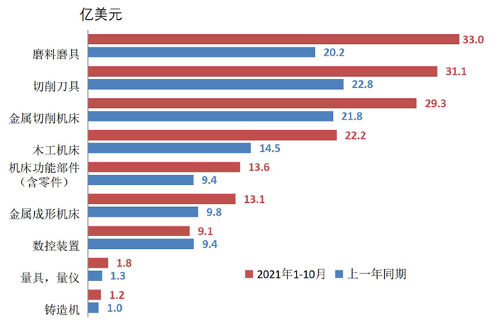 出口方面,2021年1-10月繼續保持大幅增長的趨勢。機床工具商品出口154.3億美元,同比增長39.8%。其中,金屬加工機床出口額42.4億美元,同比增長33.9%(其中,金屬切削機床出口額32.3億美元,同比增長33.9%;金屬成形機床出口額13.1億美元,同比增長33.8%)。切削刀具出口額31.1億美元,同比增長36.4%。磨料磨具出口額33.0億美元,同比增長63.2%。