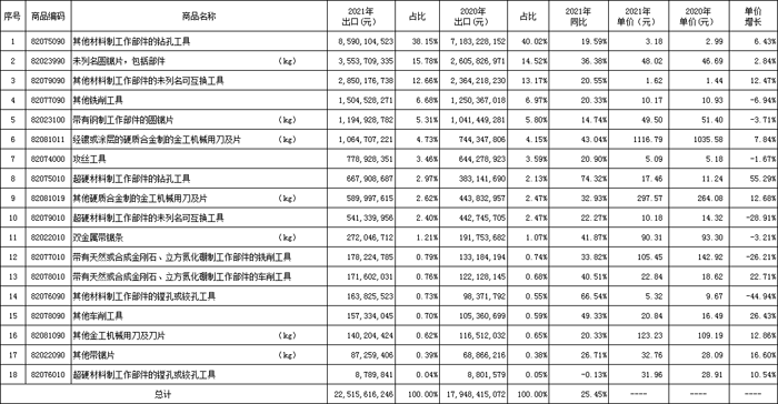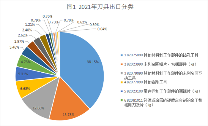 3. 2021年刀具出口主要品種:鉆頭(85.9億人民幣)、圓鋸片(47.49億人民幣)、互換工具(28.5億人民幣)、刀片(17.95億人民幣)、銑刀(15.05億人民幣)、攻絲工具(7.79億人民幣)、超硬孔加工刀具(6.68億人民幣)、超硬互換工具(5.41億人民幣)、帶鋸條(2.72億人民幣)。