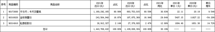 2. 2021年量具和量儀出口額(表8)14.44億人民幣,同比2020年增長30.19%,與2019年同比增長14.85%。其中,量具(千分尺、卡尺及量規)出口額11.69億人民幣,同比2020年增長30.83%;量儀(坐標測量儀、輪廓投影儀)出口額2.74億人民幣,同比2020年增長27.51%。