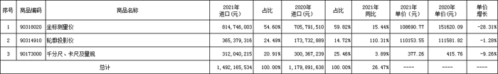 2021年量具和量儀進口額(表9)14.92億人民幣,同比2020年增長26.47%,與2019年同比增長11.73%。其中,量具進口3.12億人民幣,同比2020年增長3.89%,量儀(坐標測量儀、輪廓投影儀)進口11.8億人民幣,同比2020年增長34.18%。