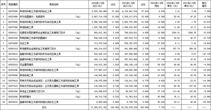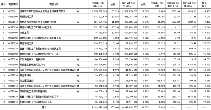 近日,中國機床工具工業協會工具分會秘書處收集和整理了2022年1-9月工具(刀具、量具、量儀)進出口海關數據,并進行了計算和分析,供行業參考。