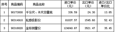 比較相同商品編碼產品,進口量具和量儀價格遠高于出口價格見下表。