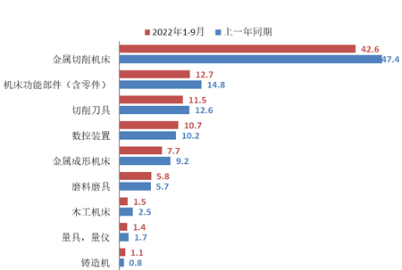 2022年1-9月金屬加工機床出口額排前五位的是:特種加工機床14.5億美元,占比31.6%;車床5.1億美元,占比11.2%;成形折彎機3.6億美元,占比7.8%;其他成形機床3.3億美元,占比7.2%;加工中心3.2億美元,占比7.0%。