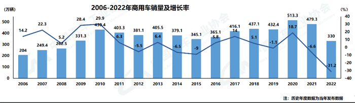 2022年,商用車產銷分別完成318.5萬輛和330萬輛,同比下降31.9%和31.2%,呈現兩位數下滑。在商用車主要品種中,與上年同期相比,客車和貨車產銷均呈較快下降。