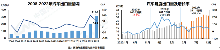 由于海外供給不足和中國車企出口競爭力大幅增強,2022年汽車出口突破300萬輛,同比增長54.4%,有效拉動行業整體增長。