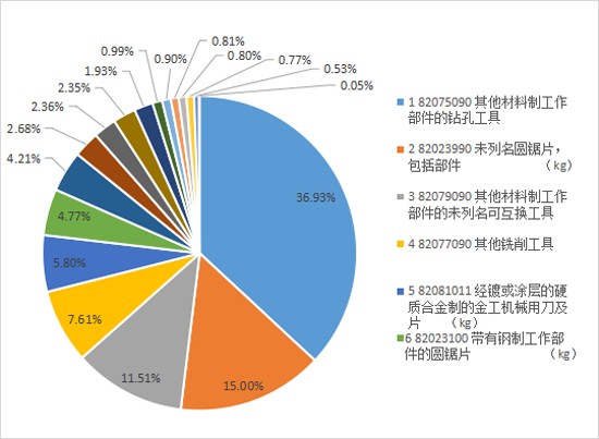 刀片(43.65億元),銑刀(12.14億元),鉆頭(10.45億元),攻絲工具(10.38億元),互換工具(3.9億元),車刀(3.06億元),超硬互換工具(2.72億元),鏜鉸刀(2.56億元)。