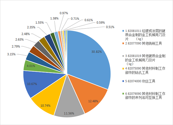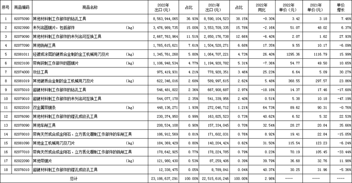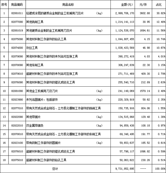 海關數據是根據海關進出口商品編碼進行分類,與行業習慣分類不完全一致。表中所列的產品可能未完全包括所有的工具產品,也可能包括了不屬于工具行業的產品。