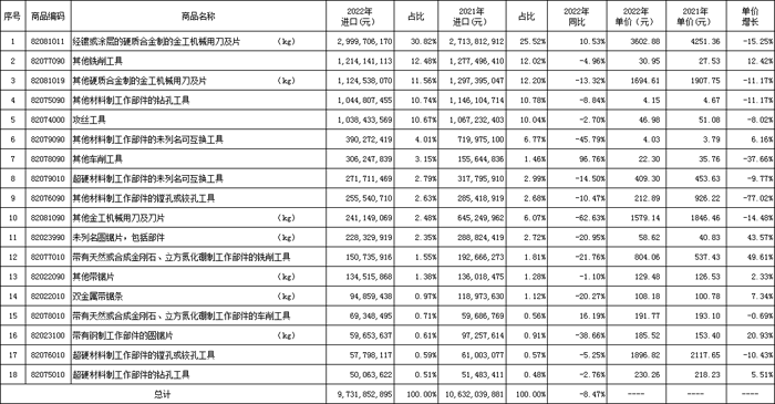 中國機床工具工業協會工具分會秘書處收集和整理了2022年工具(刀具,量具,量儀)進出口海關數據,并進行了計算和分析,供行業參考。