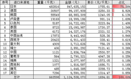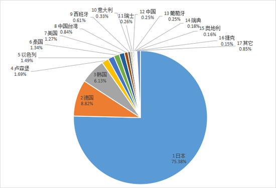 涂層刀片進口來源地(占比見表5)主要為:日本26.16%;德國18.45%;瑞典14.62%;以色列11.4%;美國8.15%;韓國5.65%;印度5.09%。非涂層刀片進口來源地(占比見表6)主要為:日本75.38%;德國8.82%;韓國6.13%;盧森堡1.69%;以色列1.49%;泰國1.34%;美國1.27%。