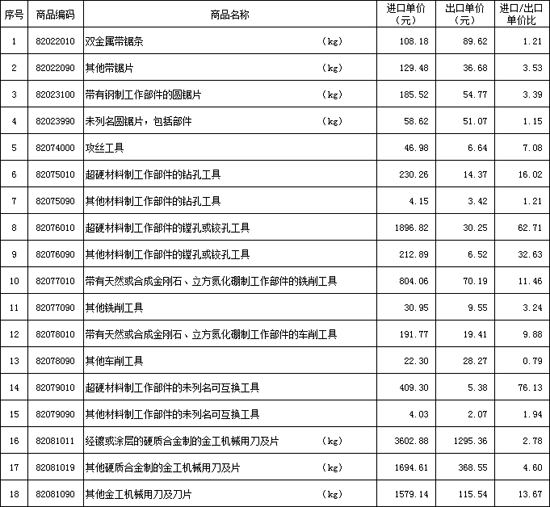 附表中,在計算產品單價時,圓鋸片,刀片,帶鋸條的單位采用公斤(kg),其它類產品以件為單位。