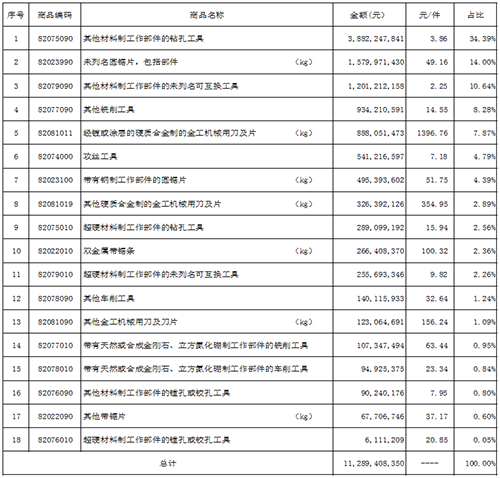 鉆頭(38.82億元),圓鋸片(20.75億元),刀片(13.38億元),互換工具(12.01億元),銑刀(9.34億元),攻絲工具(5.41億元),超硬孔加工刀具(2.89億元),帶鋸條(2.66億元),超硬互換工具(2.56億元)。