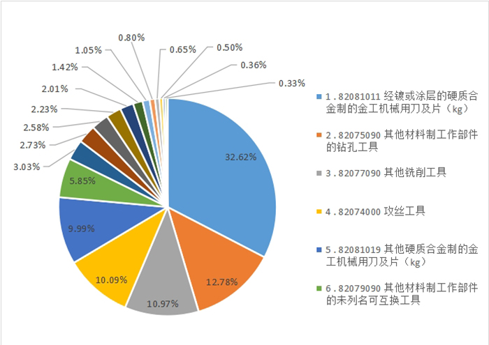 涂層刀片進(jìn)口同比下降0.43%,非涂層刀片進(jìn)口同比下降8.58%。超硬車刀下降39.4%,雙金屬帶鋸條下降38.9%,車刀下降18%,銑刀下降10.6%,絲錐下降4.8%,鉆頭增長4.7%,互換工具增長17.3%