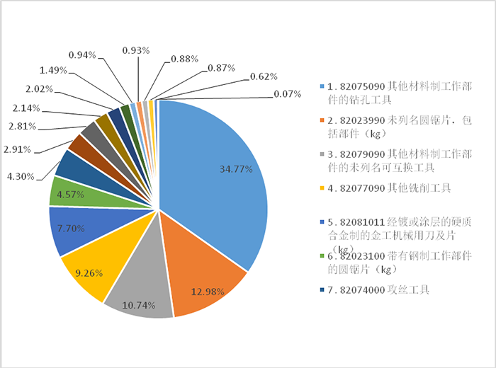 2024年刀具出口主要品種及金額分別是:鉆頭(89.18億元)、圓鋸片(45.02億元)、互換工具(27.56億元)、刀片(29.64億元)、銑刀(23.75億元)、攻絲工具(11.02億元)、超硬孔加工刀具(7.2億元)、超硬互換工具(5.49億元)、雙金屬帶鋸條(5.18億元)。