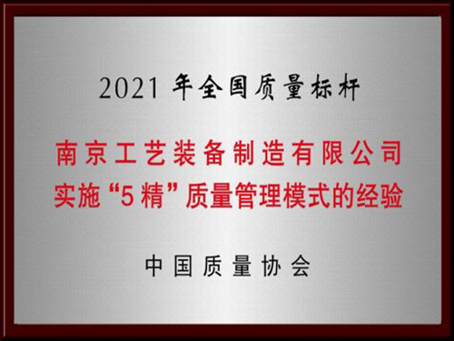 公司借鑒國內外先進管理經驗,根據國家新發展理念,對外部環境及內部能力進行綜合分析,結合行業發展趨勢和產品高精度、個性化、差異化要求高的特點,以市場需求為驅動,以用戶滿意為標準,導入并建立“精準需求”、“精益設計”、“精密生產”、“精細管理”和“精心服務”的“5精”質量管理模式。公司自創“南京工藝裝備制造有限公司“5精”質量管理模式”榮獲中質協授予的“2021年全國質量標桿”稱號。