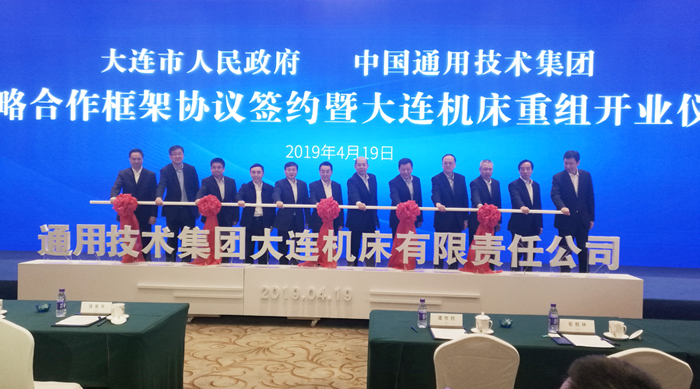 2019年4月19日,中國通用技術集團與大連市人民政府戰(zhàn)略合作框架協議簽約暨大連機床重組開業(yè)儀式在大連市舉行。遼寧省委常委、大連市委書記譚作鈞,中國通用技術集團黨組書記、董事長許憲平出席簽約儀式。遼寧省副省長崔楓林、大連市長譚成旭、中國通用技術集團總經理陸益民、中國機床工具工業(yè)協會常務副理事長毛予鋒分別致辭,大連市副市長靳國衛(wèi)和中國通用技術集團副總經理李曉春在協議書上簽字,工信部裝備司副巡視員王建宇應邀參會,簽約儀式由大連市政府秘書長衣慶燾主持。通用技術集團大連機床有限責任公司正式揭牌,歷時18個月的大連機床重整工作取得突破性進展。