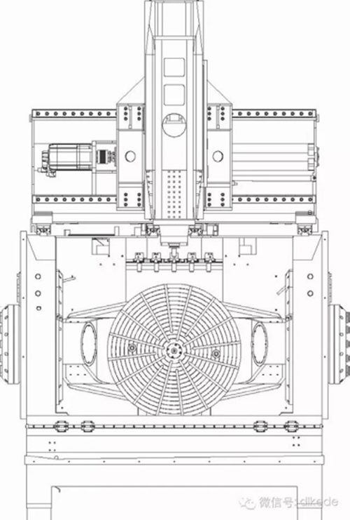 KMC800S系列五軸立式加工中心的結構采用改良的龍門框架設計,三個軸在刀具上,兩個旋轉軸在工件上,達到最優的主軸支撐;各軸的驅動和導軌都在加工區域之外的上方,不會受加工時產生的切屑等因素的影響,大大降低故障率;主軸內置于垂直的Z向滑枕中,借鑒立式坐標鏜的經典結構;主軸不會受到擺動的影響,所以刀具長度不會影響擺臂長度而影響擺動誤差,擁有更好的主軸剛性;數控回轉擺動工作臺實現雙壁支撐,Y軸采用四導軌支撐和位于中心的主驅動;A軸擺動角度為-130°~+130°。環形刀庫與機床床身融為一體,結構簡單,節省空間。