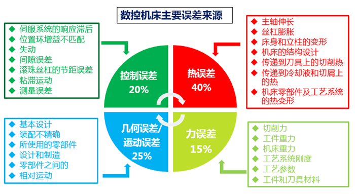 數控機床產生誤差的來源主要有:幾何誤差/運動誤差、熱誤差、控制誤差、力誤差等,通過研究發現,所有的誤差來源中熱誤差占比最高,達到近40%。