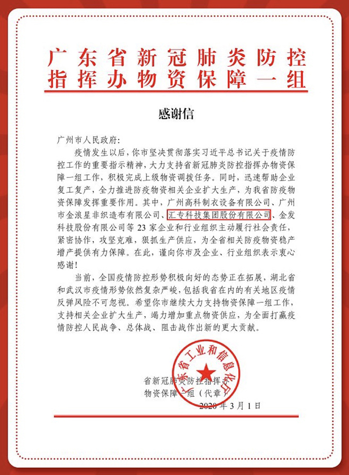日前,匯專科技集團(tuán)股份有限公司受到廣東省新冠肺炎防控指揮辦物資保障一組的點名表揚(yáng)! 省防控指揮辦對企業(yè)主動履行社會責(zé)任,保障防疫物資穩(wěn)產(chǎn)增產(chǎn)做出的貢獻(xiàn)表示感謝。