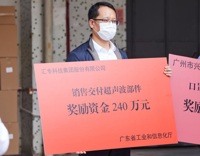 就在此前的2月28日,廣東省舉行了“重點防疫物資生產(chǎn)企業(yè)技改、裝備獎勵政策兌現(xiàn)儀式”,匯專科技作為此次三家獲獎企業(yè)中唯一提供口罩超聲焊接系統(tǒng)的企業(yè)領(lǐng)取了省財政獎勵240萬元。儀式結(jié)束后,廣東省副省長覃偉中向匯專科技李偉秋總經(jīng)理了解口罩超聲焊接系統(tǒng)生產(chǎn)和產(chǎn)能情況,勉勵匯專科技繼續(xù)發(fā)揚(yáng)敢于擔(dān)當(dāng)?shù)木瘢σ愿氨U袭a(chǎn)能,為取得抗疫勝利做出更大貢獻(xiàn)。