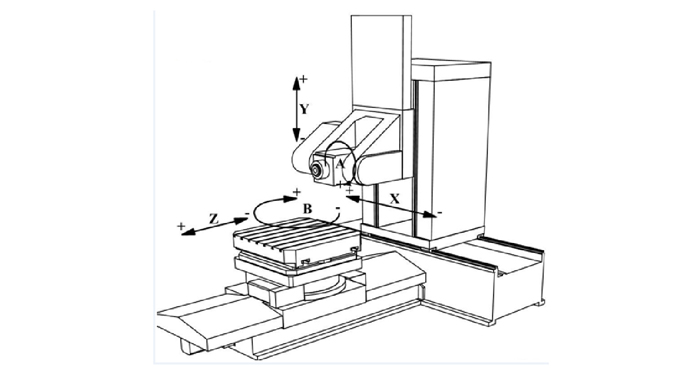 機床各進給軸電機全部采用交流伺服電機,可實現5軸聯(lián)動插補、刀具補償、絲桿螺距誤差補償和測量系統(tǒng)誤差補償等功能。機床X、Y、Z、A、B采用全閉環(huán)控制,提高機床加工精度。機床總體結構及各軸示意如下圖所示。