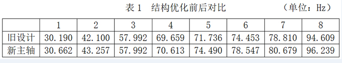 對比機床原設計動態特性仿真分析結果以及銑主軸經過改進設計的機床動態特性結果,見表1。