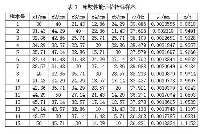 根據設計變量的變化范圍,采用拉丁超立方設計方法,使試驗設計矩陣中各個樣本點因素水平分布盡可能均勻,得到15組試驗數據,并對得到的數據點進行仿真,形成床鞍性能評價指標樣本(見表3)。