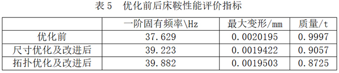 通過表5可知,進行拓撲優化后,機床的一階固有頻率有所提升,并且最大變形量變化很小,且比原結構的最大變形量小,同時床鞍的質量又減少了3.6%,達到了設計目的,因此該設計是合理的。