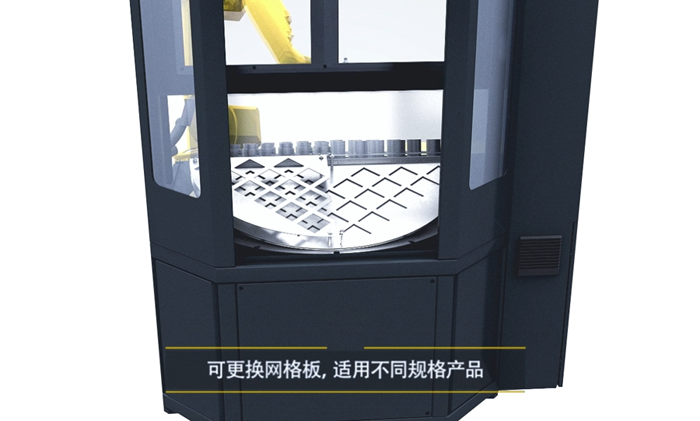 工作站配置旋轉(zhuǎn)裝載系統(tǒng)和通用網(wǎng)格板,最大工件直徑230mm;網(wǎng)格板的高度可調(diào),最大250mm;可輕松實現(xiàn)機(jī)器人工作時設(shè)置新批次。