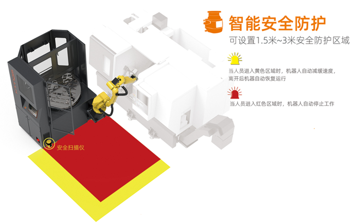工作站具有智能安全防護(hù)功能:配備地面掃描儀,可自動減慢和停止機(jī)器人,無需圍欄,保證人員安全,增強(qiáng)安全防護(hù)級別。