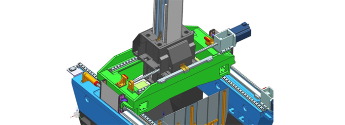 滑枕為四方向導軌,橫梁部分為“箱中箱”結構,直線軸采用雙絲杠驅動結構,保證機床長期運轉的高精度、高剛性和高穩定性(見圖3)。