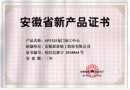 蔣建國大師裝配的龍門加工中心產(chǎn)品榮獲《安徽省新產(chǎn)品證書》。