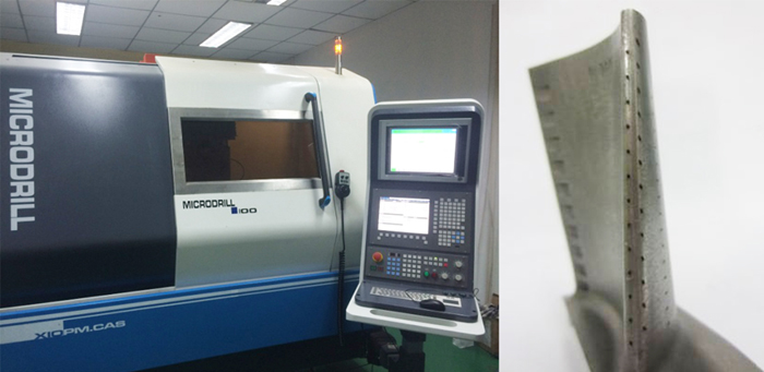 基于開放式數控技術平臺,公司通過與激光設備廠商、航空制造領域的用戶密切合作,開發出雙通道11軸超快激光加工用專用數控系統。系統解決了多通道控制、RTCP、高速程序預處理、焦距測量、三維測量、光路切換、四光楔掃描以及功率檢測等關鍵技術。系統的一個通道實現5軸聯動,用于葉片工件姿態轉換;一個通道實現 6 軸聯動,用于激光設備光束指向調整和打孔檢測。設備適用于金屬、非金屬等材料表面的微結構處理,如微腔、型腔、盲孔、通孔、異型孔異型槽及復雜形貌微結構的加工等,并在航空制造領域進行應用,解決了航空發動機葉片打孔加工的技術瓶頸。