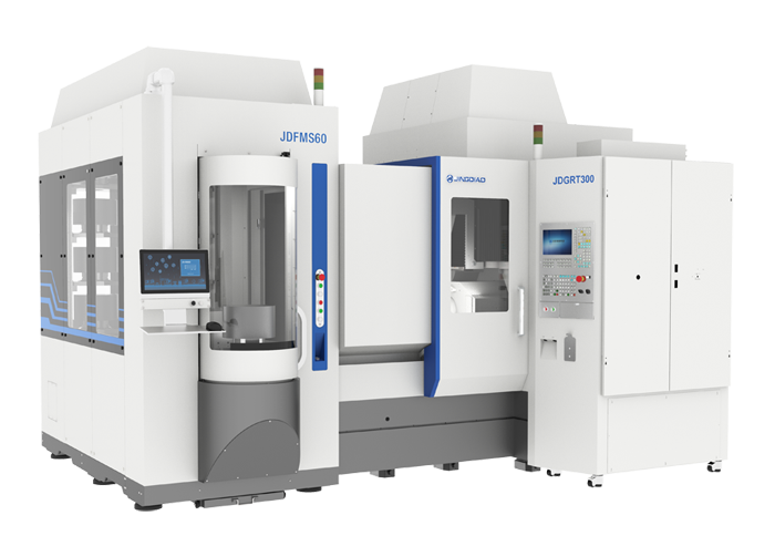 另一臺復(fù)合型五軸高速加工中心JDGRT150,搭載JDFMS25柔性制造系統(tǒng),現(xiàn)場演示了多款電子治具的精密加工及自動上下料過程。樣件采用五軸分度加工方式,一次裝夾完成多面加工,產(chǎn)品精度和表面質(zhì)量符合要求。通過配合自動化單元,該機(jī)可實現(xiàn)小批量多品種產(chǎn)品的連續(xù)加工,提高生產(chǎn)節(jié)拍和機(jī)床使用率。