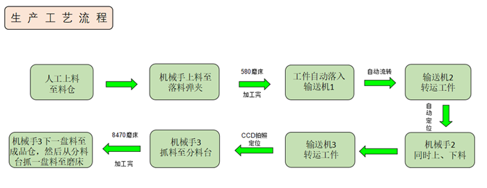 該生產(chǎn)線為自動(dòng)流水線的整體布局,工件由左到右先經(jīng)YHDM580B進(jìn)行粗磨,再由YHMM300A進(jìn)行精磨,最后由YH2M8470進(jìn)行工件的拋光。工件加工時(shí),均由機(jī)械手進(jìn)行上下料。