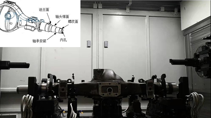 橋殼通常采用3臺(tái)機(jī)床加工,工藝為“鏜內(nèi)孔→車軸頭及法蘭→磨軸頭軸承位”,法蘭、螺紋與軸承位在兩臺(tái)機(jī)床上加工,法蘭與螺紋相對軸承位的同軸度、垂直度不易控制。車橋規(guī)格種類眾多、市場需求變化快,需經(jīng)常換產(chǎn),原工藝換產(chǎn)時(shí)間較長,小批量生產(chǎn)時(shí)換產(chǎn)時(shí)間超過加工時(shí)間,效率低、勞動(dòng)強(qiáng)度大,影響交貨周期。在新產(chǎn)品小批量試制時(shí),原設(shè)備難以適應(yīng)。