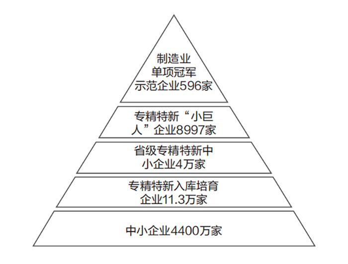隨著國家關(guān)于制造業(yè)單項(xiàng)冠軍、專精特新“小巨人”企業(yè)的培育政策出臺(tái),其發(fā)展得到各方重視和支持,地方政府相繼出臺(tái)符合各自地方實(shí)際的扶持培育計(jì)劃,國內(nèi)也已初步建立了具有中國特色的專精特新企業(yè)梯度培育工作體系并逐步完善(如圖所示)。