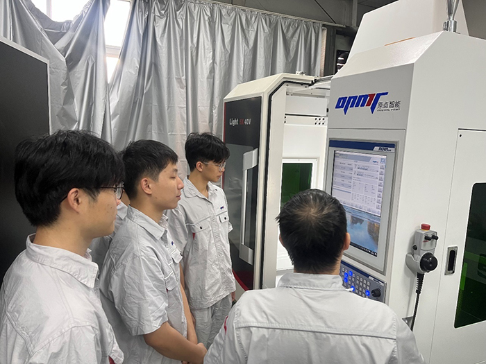 資深工程師向聯合培養研究生講解激光加工機床的應用