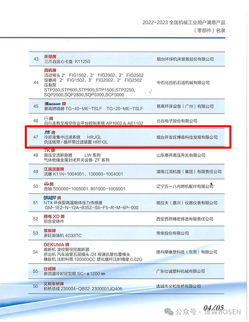1. 煙臺(tái)博森產(chǎn)品入選“全國(guó)機(jī)械工業(yè)用戶滿意產(chǎn)品(零部件)名錄”