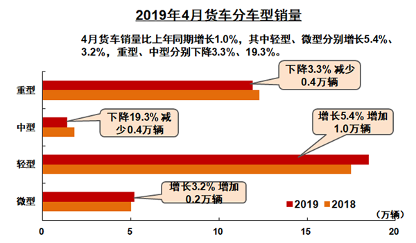 1-4月,貨車產(chǎn)銷同比增長4.48%和1.94%。其中:重型貨車產(chǎn)量同比增長1.51%,銷量下降0.41%;中型貨車產(chǎn)銷同比下降27.19%和19.87%。客車產(chǎn)銷同比下降9.62%和2.96%。其中:大型客車產(chǎn)銷同比增長0.25%和8.15%,中型客車產(chǎn)量同比下降6.70%,銷量增長2.18%。