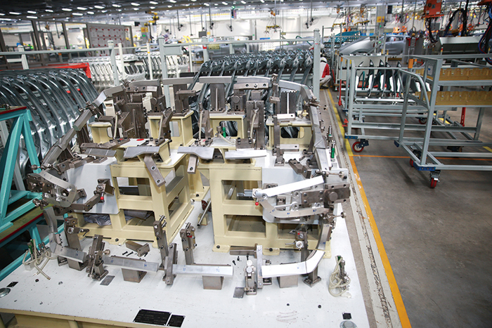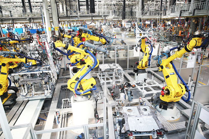 這是自動化率最高的車間,使用機器人多達(dá)525臺,焊接自動化率達(dá)98.7%。門蓋外板料筐輸送、門蓋總成輸送及分總成輸送采用EMS,防飛濺液采用機器人噴涂技術(shù),VIN打刻采用機器人在線打刻技術(shù),最大化地減少了車間人員數(shù)量。