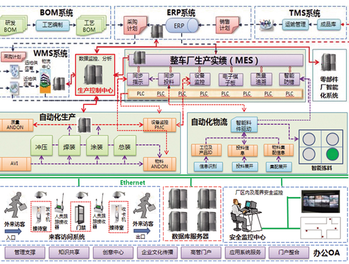 是指以生產(chǎn)控制為中心,包括網(wǎng)絡(luò)系統(tǒng)平臺、信息系統(tǒng)平臺、自動化裝備平臺:網(wǎng)絡(luò)系統(tǒng)平臺包括網(wǎng)絡(luò)系統(tǒng)、監(jiān)控系統(tǒng)、一卡通系統(tǒng);信息系統(tǒng)平臺包括ERP、MES、WMS、OA、PDM等;自動化裝備平臺包括焊接機器人、ANDON系統(tǒng)、智能料架系統(tǒng)、AVI系統(tǒng)、PMC系統(tǒng)、AGV系統(tǒng)。這是智能化工廠的中樞神經(jīng),通過收集關(guān)聯(lián)系統(tǒng)信息,進(jìn)行分析,為快速處理現(xiàn)場問題提供依據(jù)。