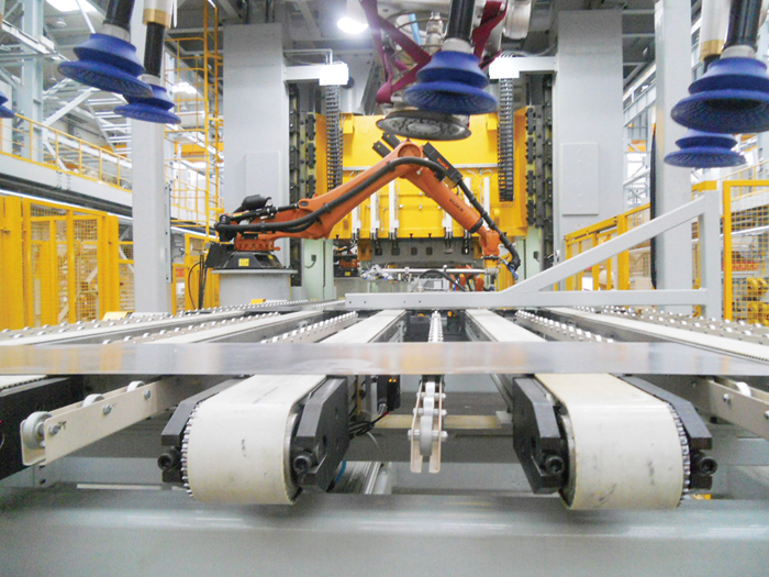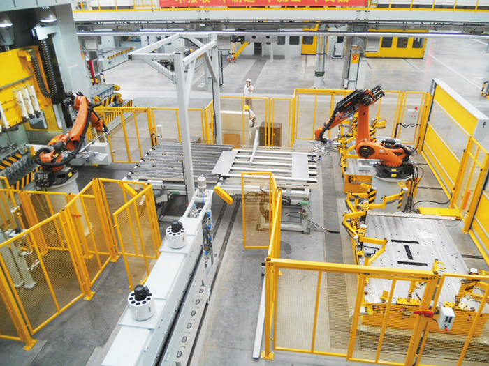 采用先進(jìn)節(jié)能的連續(xù)生產(chǎn)模式,相比傳統(tǒng)的斷續(xù)生產(chǎn)模式,避免了因壓力機的頻繁啟停造成的時間及能源浪費,綜合節(jié)能達(dá)20%,年節(jié)約用電152萬kWh。同時連續(xù)生產(chǎn)模式在不降低生產(chǎn)節(jié)拍前提下,降低了壓機滑塊速度約30%,更好地保證沖壓件質(zhì)量。所有線體均采用先進(jìn)的數(shù)控液壓拉伸墊,相比傳統(tǒng)的氣動拉伸墊,生產(chǎn)過程中壓力波動可控制在10%以內(nèi),提高了沖壓件的成形質(zhì)量。